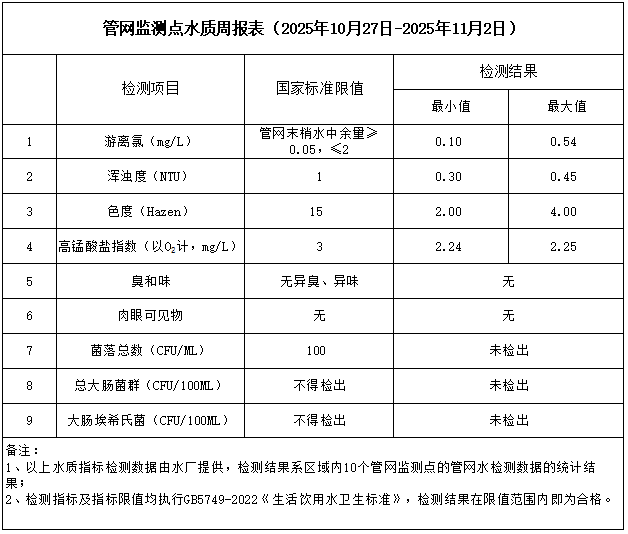 管网监测点水质周报表(2025年10月27日-2025年11月2日)