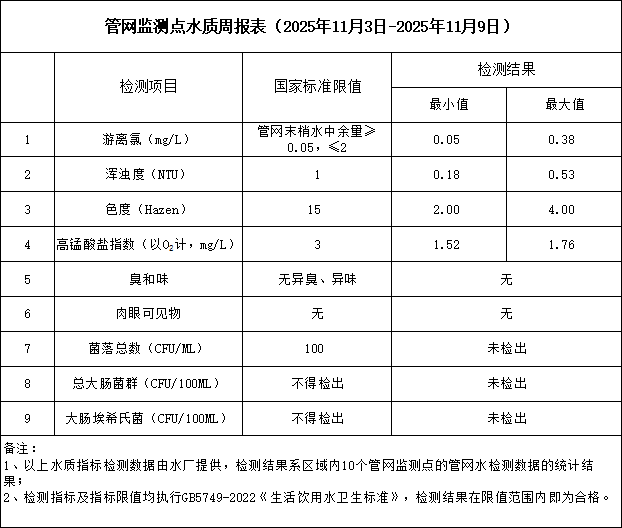 管网监测点水质周报表(2025年11月3日-2025年11月9日)