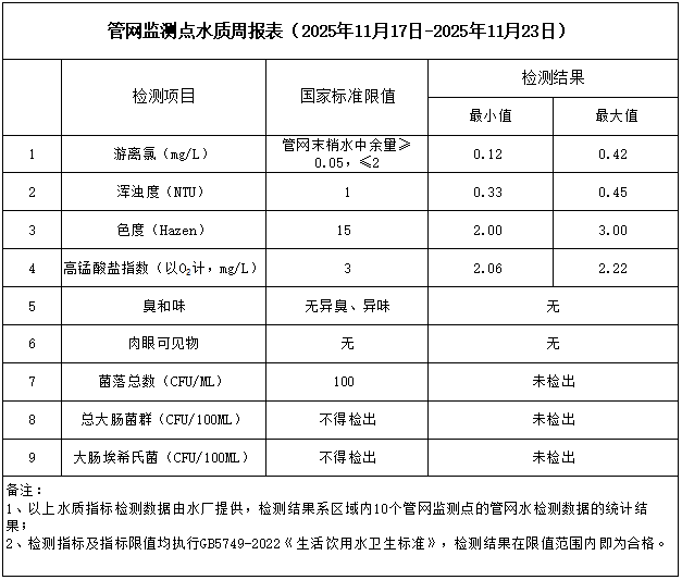 管网监测点水质周报表(2025年11月17日-2025年11月23日)