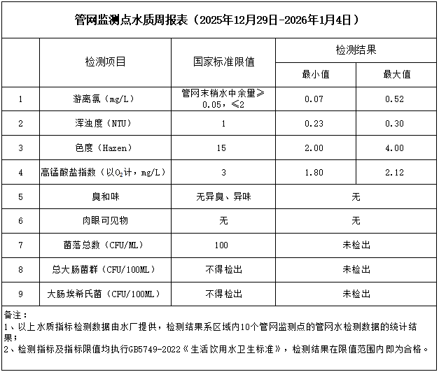 管网监测点水质周报表(2025年12月29日-2026年1月4日)