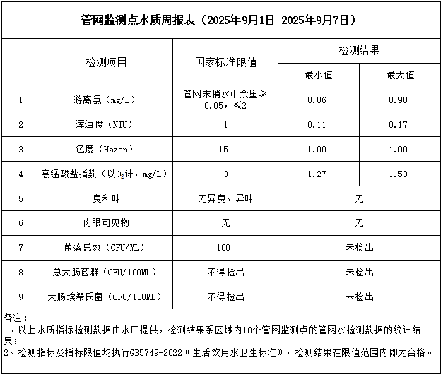 管网监测点水质周报表(2025年9月1日-2025年9月7日)