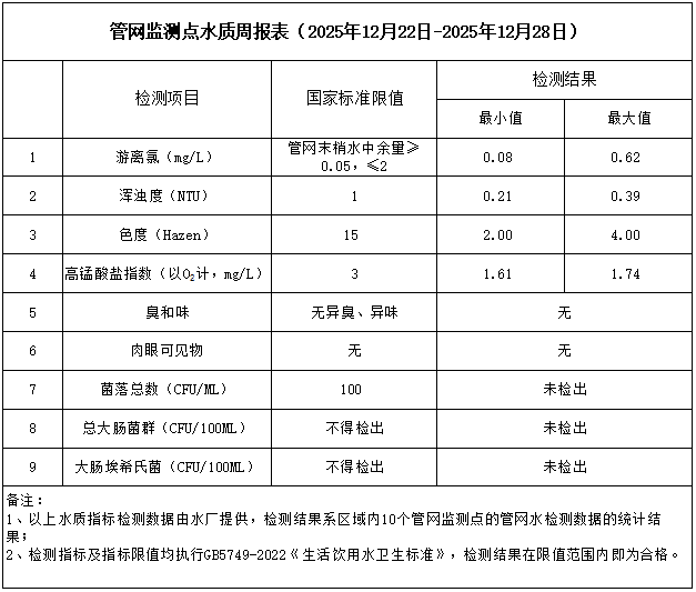 管网监测点水质周报表(2025年12月22日-2025年12月28日)