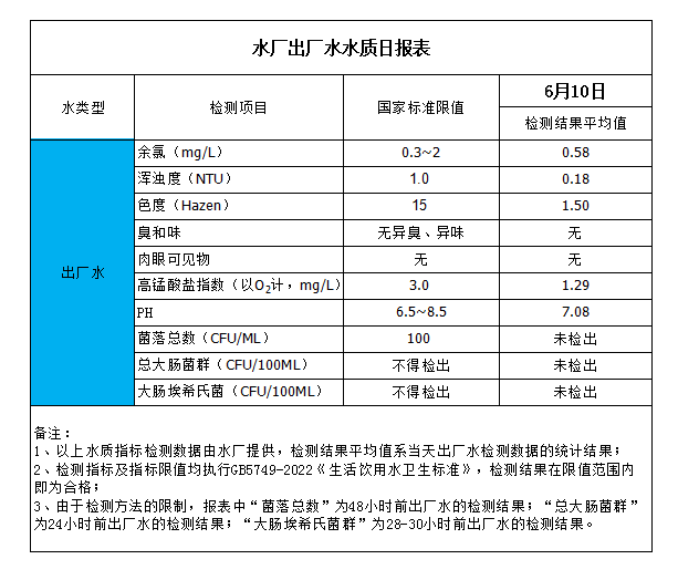 水厂出厂水水质日报表(2023-6-10)