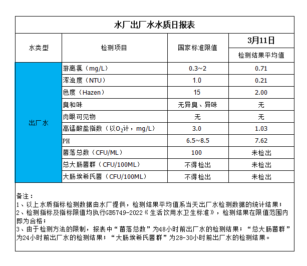 水厂出厂水水质日报表(2024-3-11)